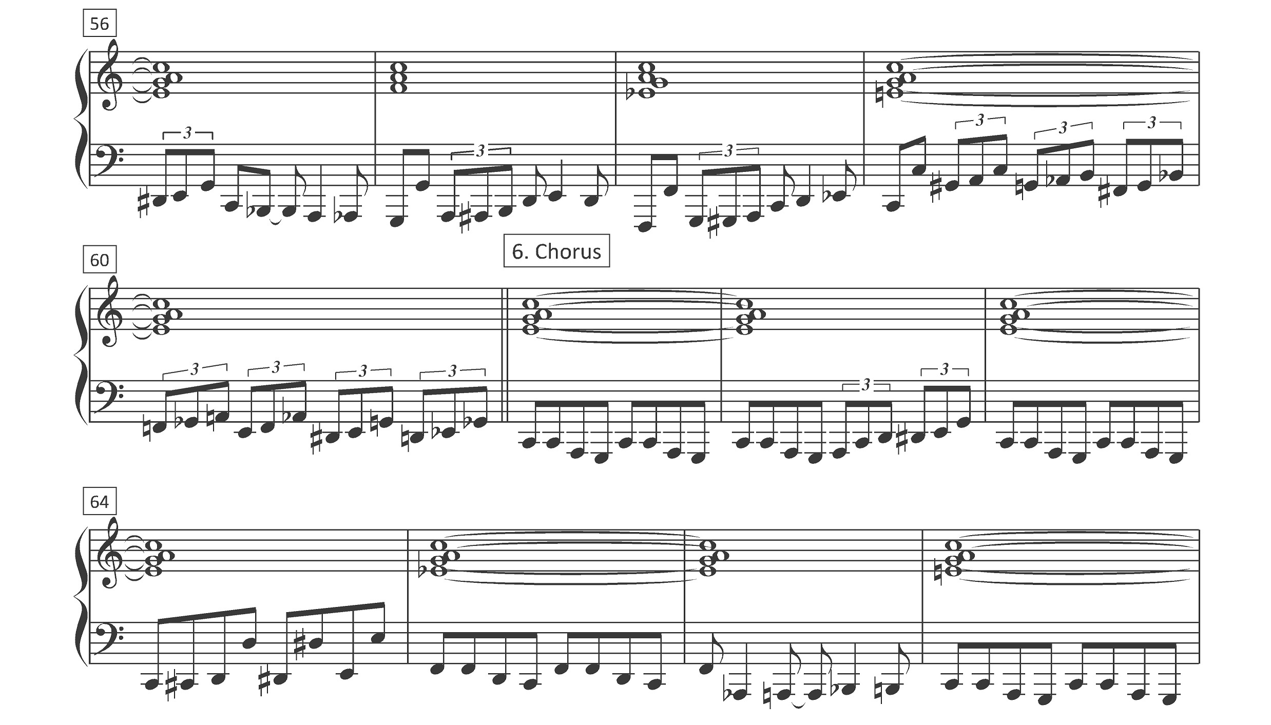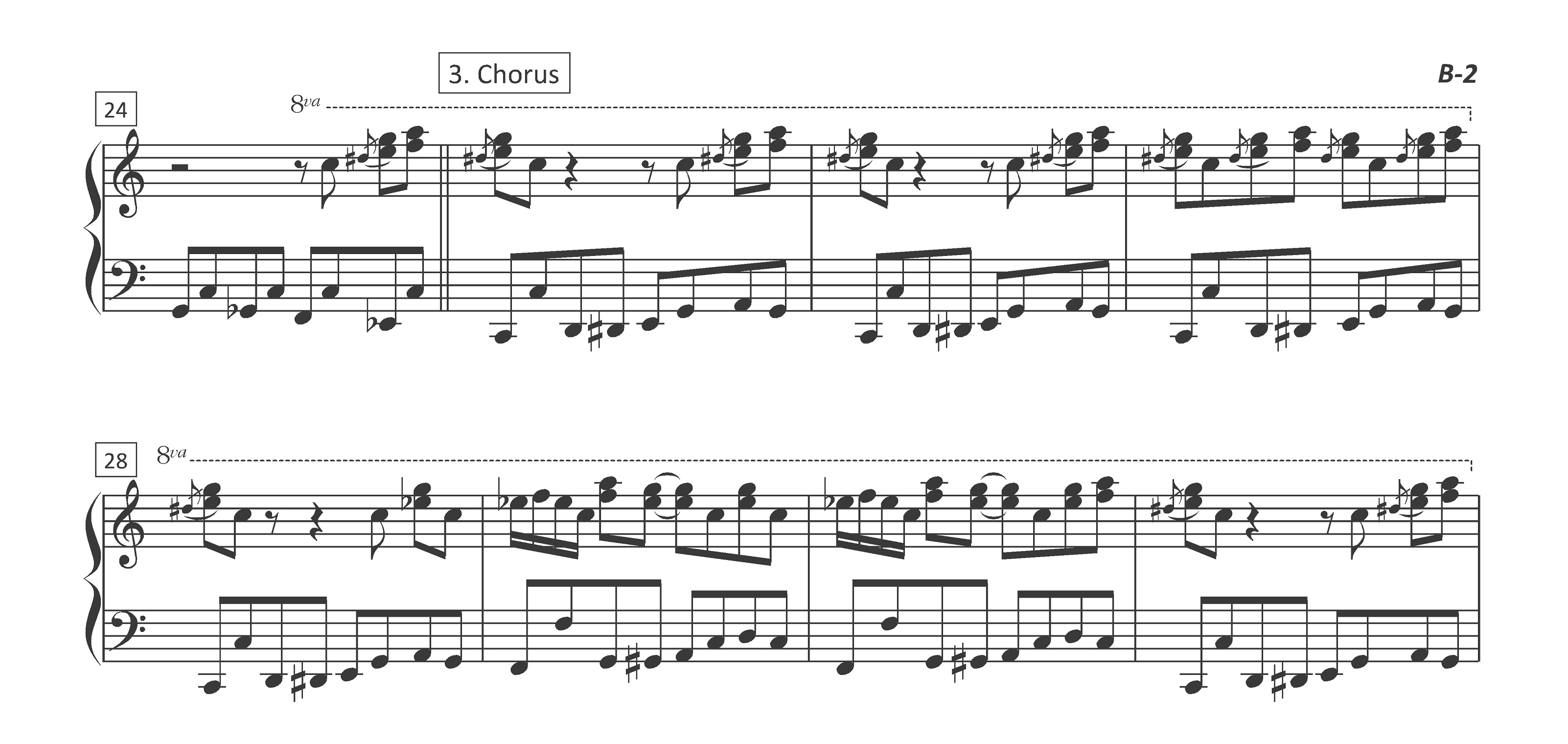 Probeseiten der Übungs-Version C: 1. Chorus - Anfang 3. Chorus (Solo r.H.) - Übergang 5.-6. Chorus (Bass-Solo)