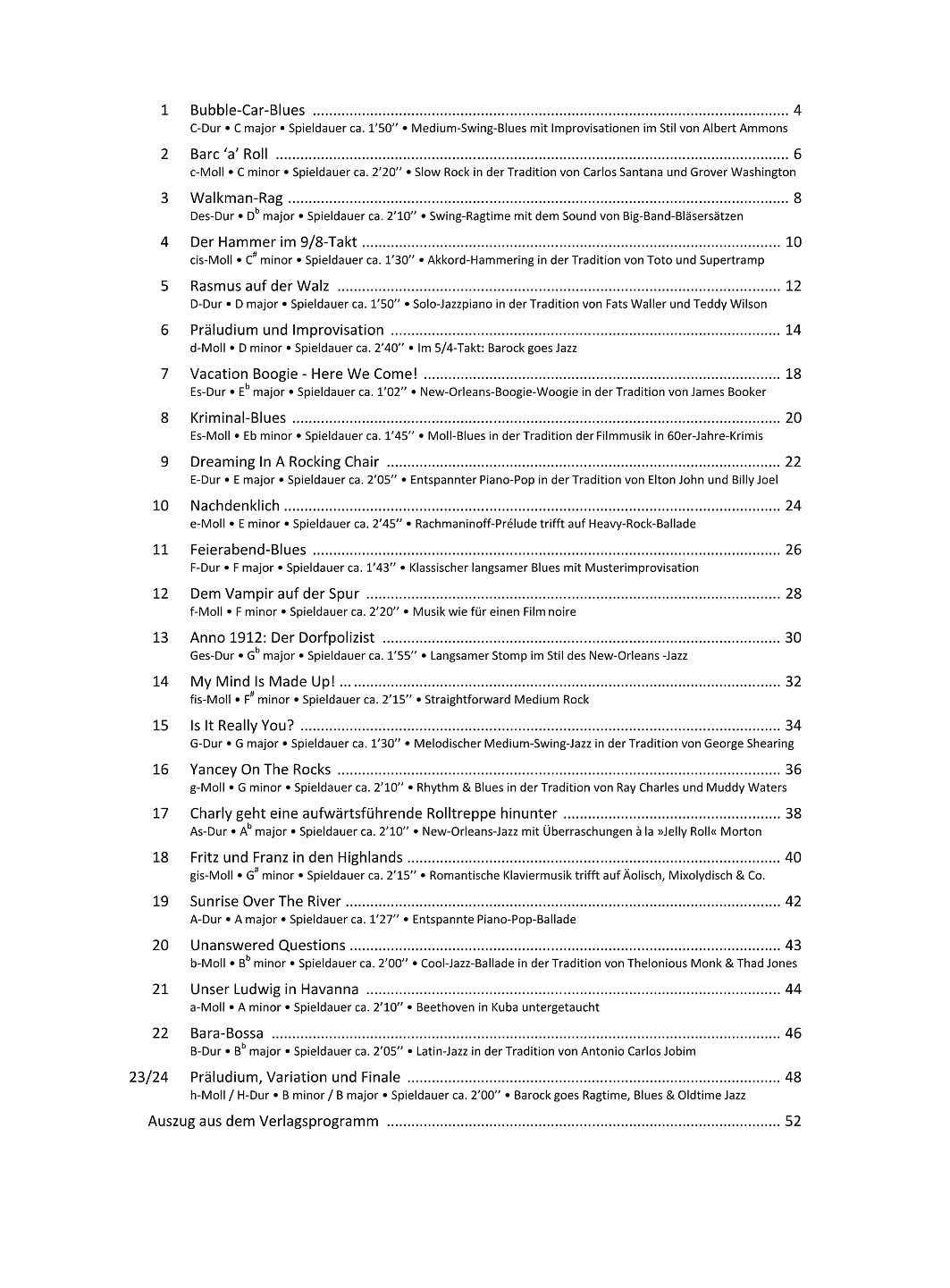 1 Bubble-Car-Blues • Medium-Swing-Blues mit Improvisationen im Stil von Albert Ammons • C-Dur 2 Barc ‘a’ Roll • Slow Rock in der Tradition von Carlos Santana und Grover Washington • c-Moll 3 Walkman-Rag • Swing-Ragtime mit dem Sound von Big-Band-Bläsersätzen • Des-Dur 4 Der Hammer im 9/8-Takt • Akkord-Hammering in der Tradition von Toto und Supertramp • cis-Moll 5 Rasmus auf der Walz • Solo-Jazzpiano in der Tradition von Fats Waller und Teddy Wilson • D-Dur 6 Präludium und Improvisation • Im 5/4-Takt: Barock goes Jazz • d-Moll 7 Vacation Boogie - Here We Come! • New-Orleans-Boogie-Woogie in der Tradition von James Booker • Es-Dur 8 Kriminal-Blues • Moll-Blues in der Tradition der Filmmusik in 60er-Jahre-Krimis • Es-Moll 9 Dreaming In A Rocking Chair • Entspannter Piano-Pop in der Tradition von Elton John und Billy Joel • E-Dur 10 Nachdenklich • Rachmaninoff-Prélude trifft auf Heavy-Rock-Ballade • e-Moll 11 Feierabend-Blues • Klassischer langsamer Blues mit Musterimprovisation • F-Dur 12 Dem Vampir auf der Spur • Musik wie für einen Film noire • f-Moll 13 Anno 1912: Der Dorfpolizist • Langsamer Stomp im Stil des New-Orleans -Jazz • Ges-Dur 14 My Mind Is Made Up! • Straightforward Medium Rock • fis-Moll 15 Is It Really You? • Melodischer Medium-Swing-Jazz in der Tradition von George Shearing • G-Dur 16 Yancey On The Rocks • Rhythm & Blues in der Tradition von Ray Charles und Muddy Waters • g-Moll 17