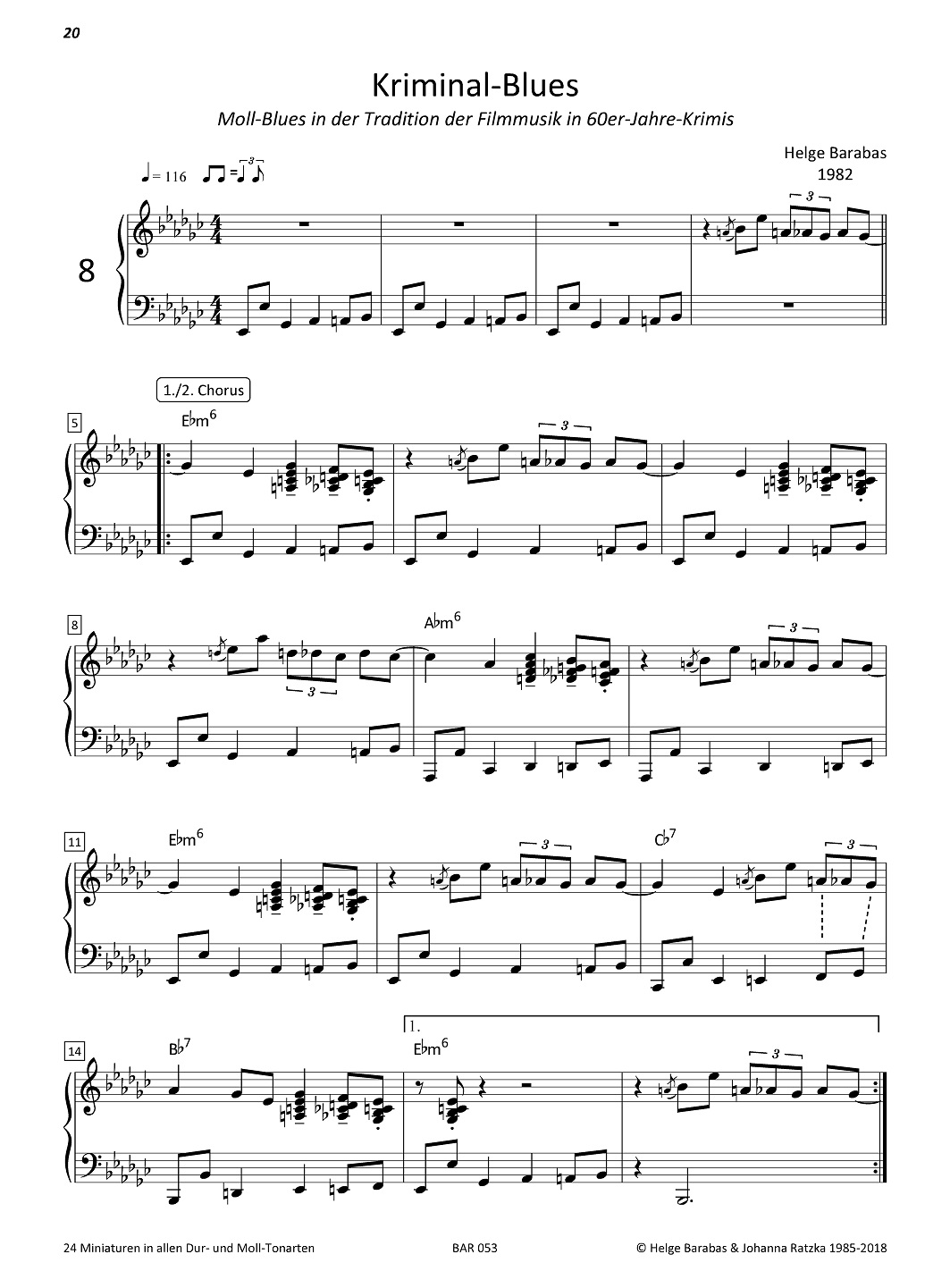 Äolisch, Mixolydisch & Co. • gis-Moll 19 Sunrise Over The River • Entspannte Piano-Pop-Ballade • A-Dur 20 Unanswered Questions • Cool-Jazz-Ballade in der Tradition von Thelonious Monk & Thad Jones • b-Moll 21 Unser Ludwig in Havanna • Beethoven in Kuba untergetaucht • a-Moll 22 Bara-Bossa • Latin-Jazz in der Tradition von Antonio Carlos Jobim • B-Dur 23/24 Präludium, Variation und Finale • Barock goes Ragtime, Blues & Oldtime Jazz • h-Moll / H-Dur